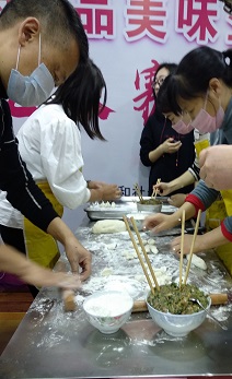 捏餃子比賽也在緊張激烈的進行著,她揉面,你搟皮,我裝餡忙而不亂,女神、男神一起動手。