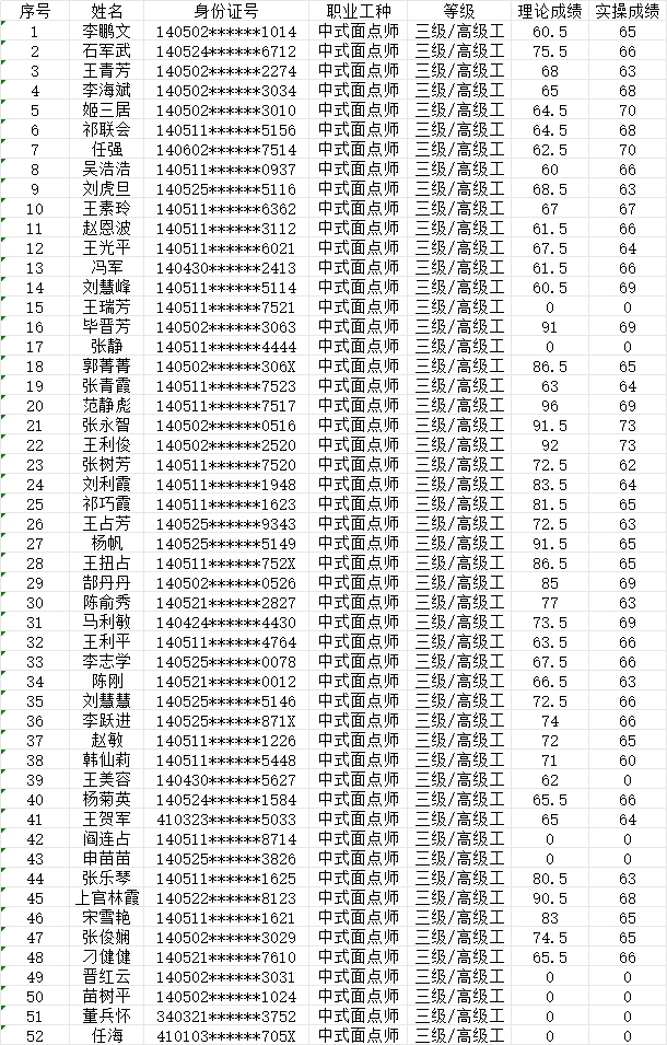 晉城市潔霸清潔服務(wù)股份有限公司職業(yè)技能等級認(rèn)定中心2024年6月29日第4批中式面點(diǎn)師高級認(rèn)定人員成績公示