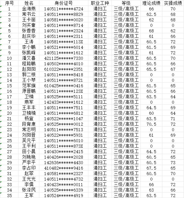 晉城市潔霸清潔服務股份有限公司職業(yè)技能等級認定中心現將2024年7月14日認定人員成績公示如下: