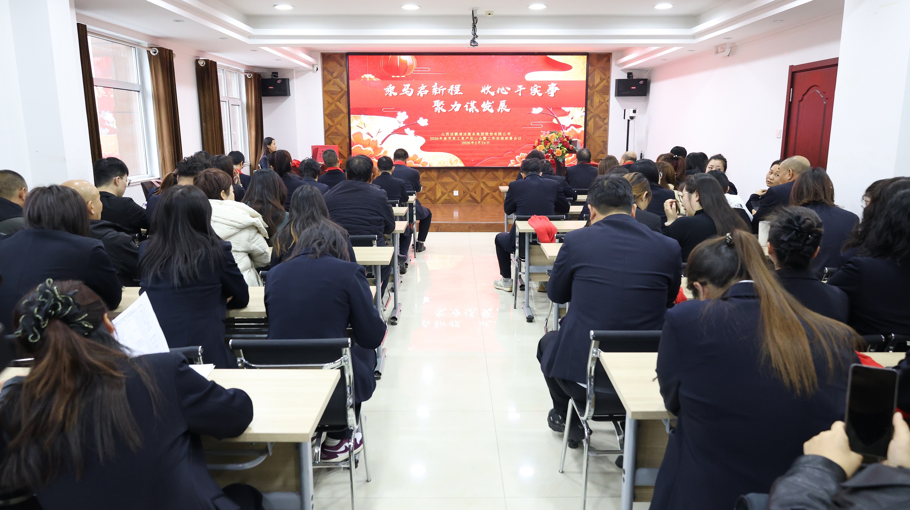 會議召開前,山西潔霸物業(yè)、合眾力勞務(wù)派遣、辦公室、保潔部、百潔物業(yè)、潔霸超市、潔霸洗業(yè)、財務(wù)部、清洗一部、清洗二部、清洗三部、運營中心、職業(yè)培訓(xùn)學(xué)校、人力資源部、智能科技等子公司和部門分別登臺展示團隊士氣和精神風(fēng)貌,集中展現(xiàn)2026年的奮斗目標(biāo)和決心,凝聚團隊向心力。